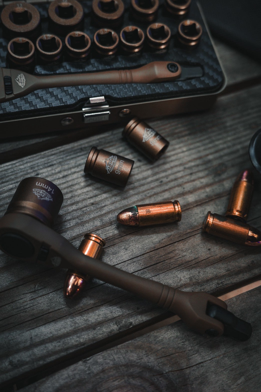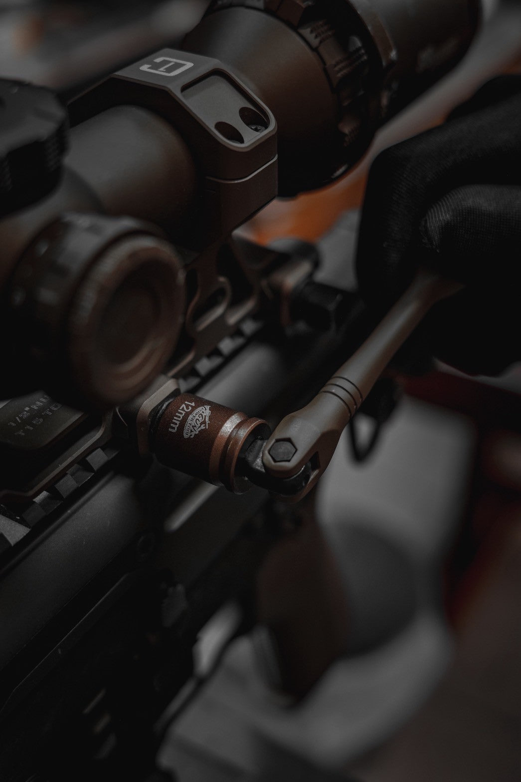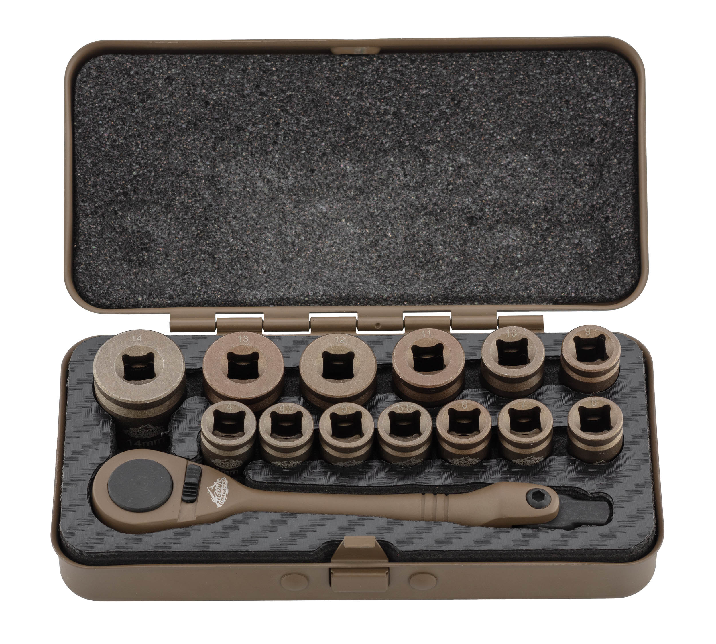 The GUN POWER TOOL 14-piece Cerakote Shell Socket Kit is a high-performance tactical tool set designed for demanding users. It includes a 72-tooth ratchet wrench and 13 stylish "cartridge" sockets, all with a durable Cerakote finish that withstands wear and extreme conditions.