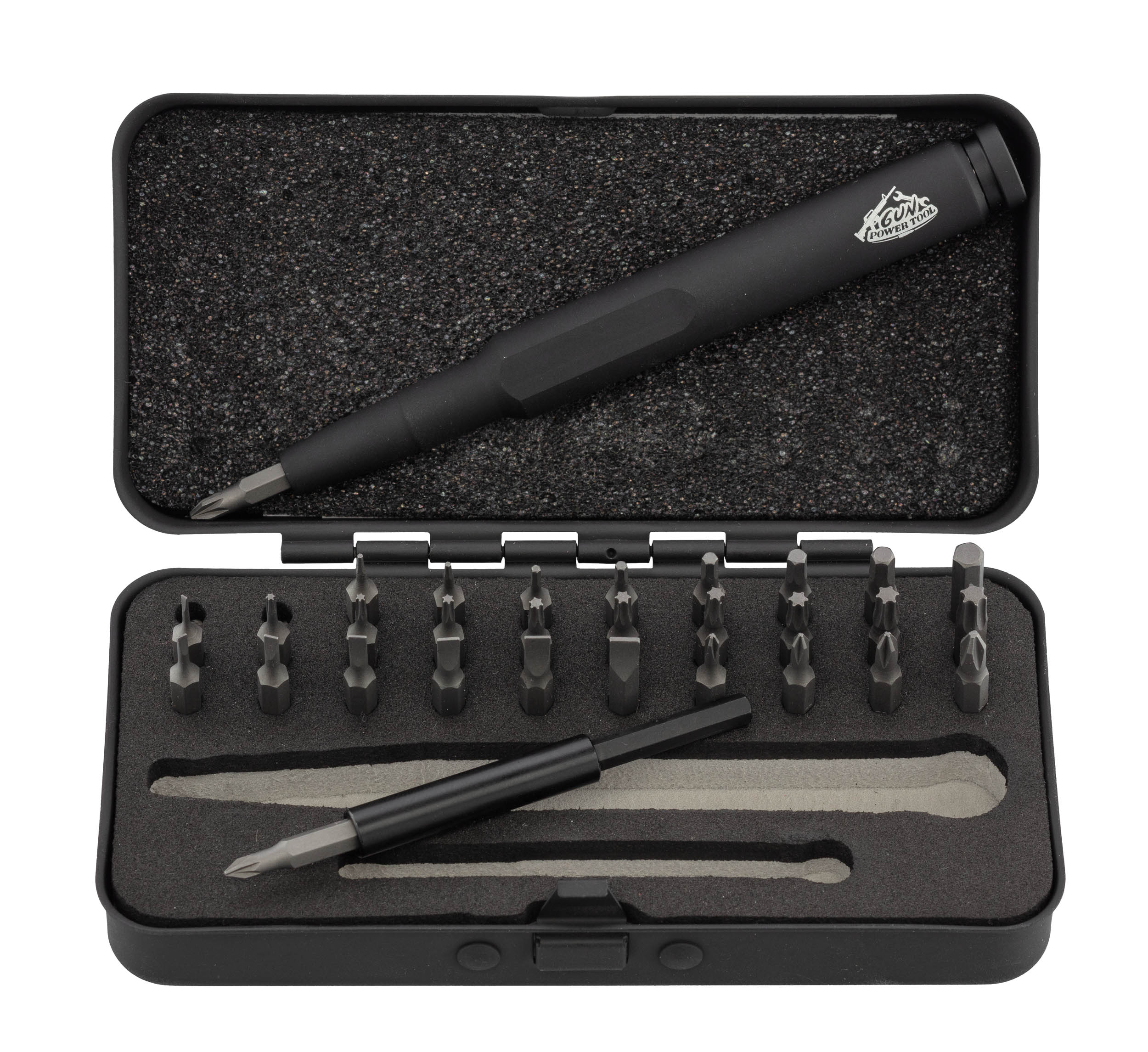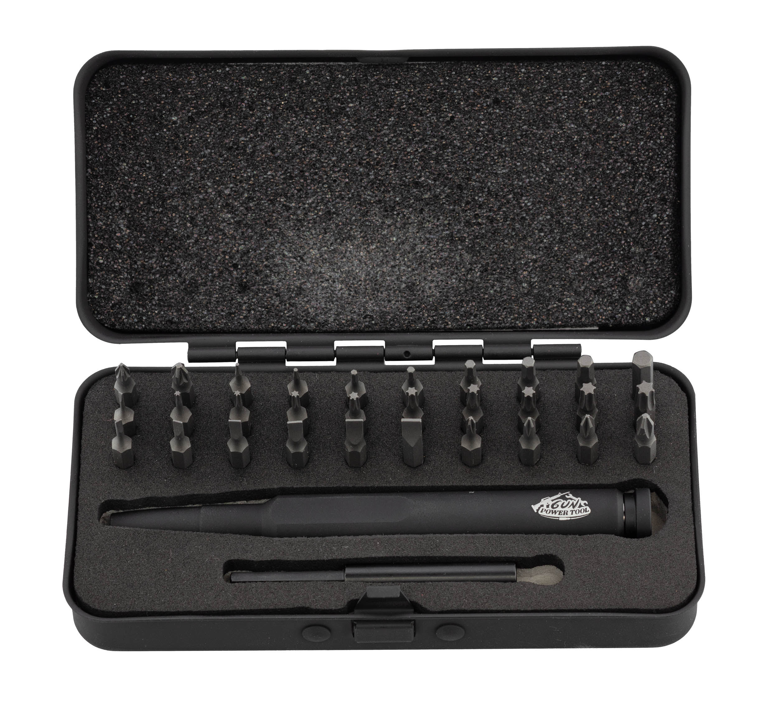The GUN POWER TOOL Precision Set 32 pcs Cerakote is a micro-technical screwdriving kit inspired by tactical design. Compact and durable, it combines high-hardness bits, a CNC-machined handle, and a Cerakote steel case for field or workshop use.