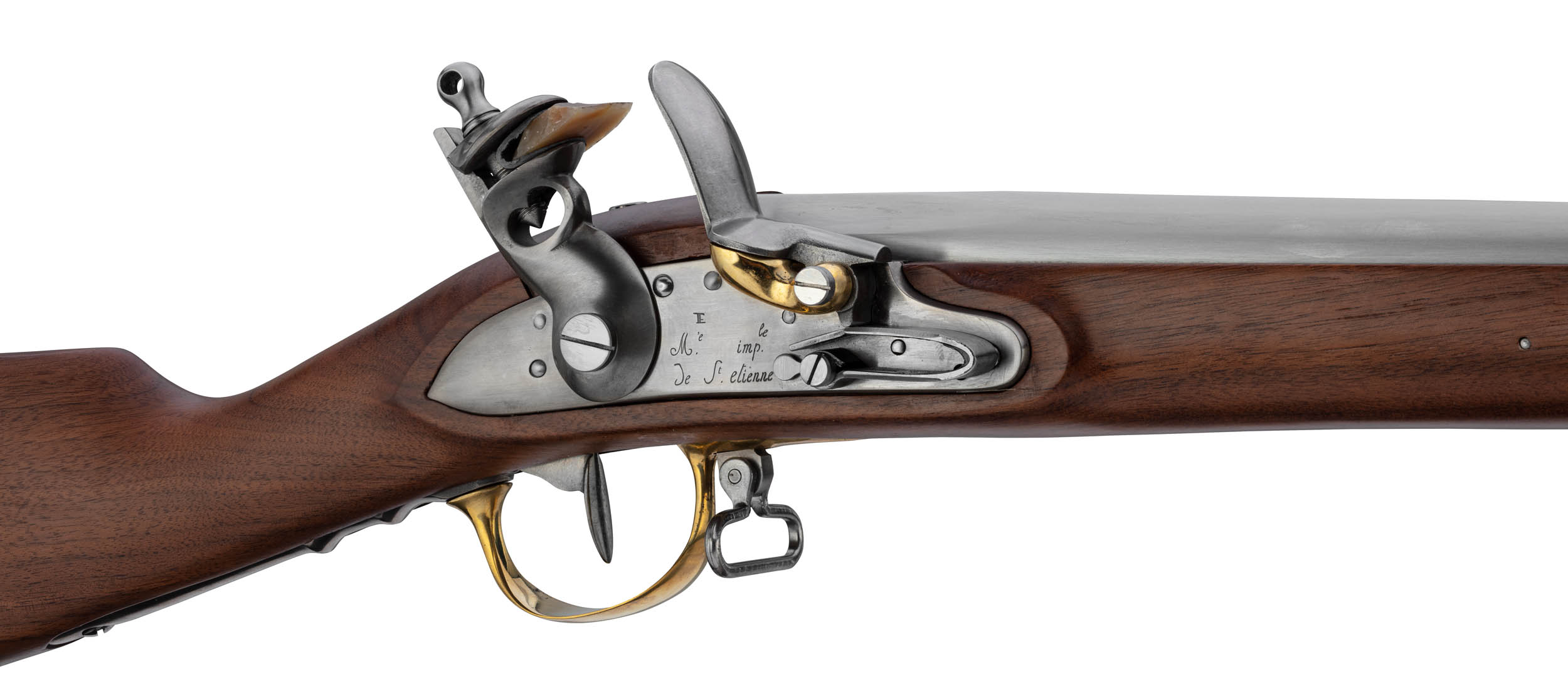 La platine à silex fonctionne selon le mécanisme de percussion par étincelle typique du début du XIXe siècle. Le mobilier en laiton (pontet, plaque de couche, embouchoir) résiste à la corrosion, tandis que la grenadière en acier renforce la solidité à l’attache de la bretelle.