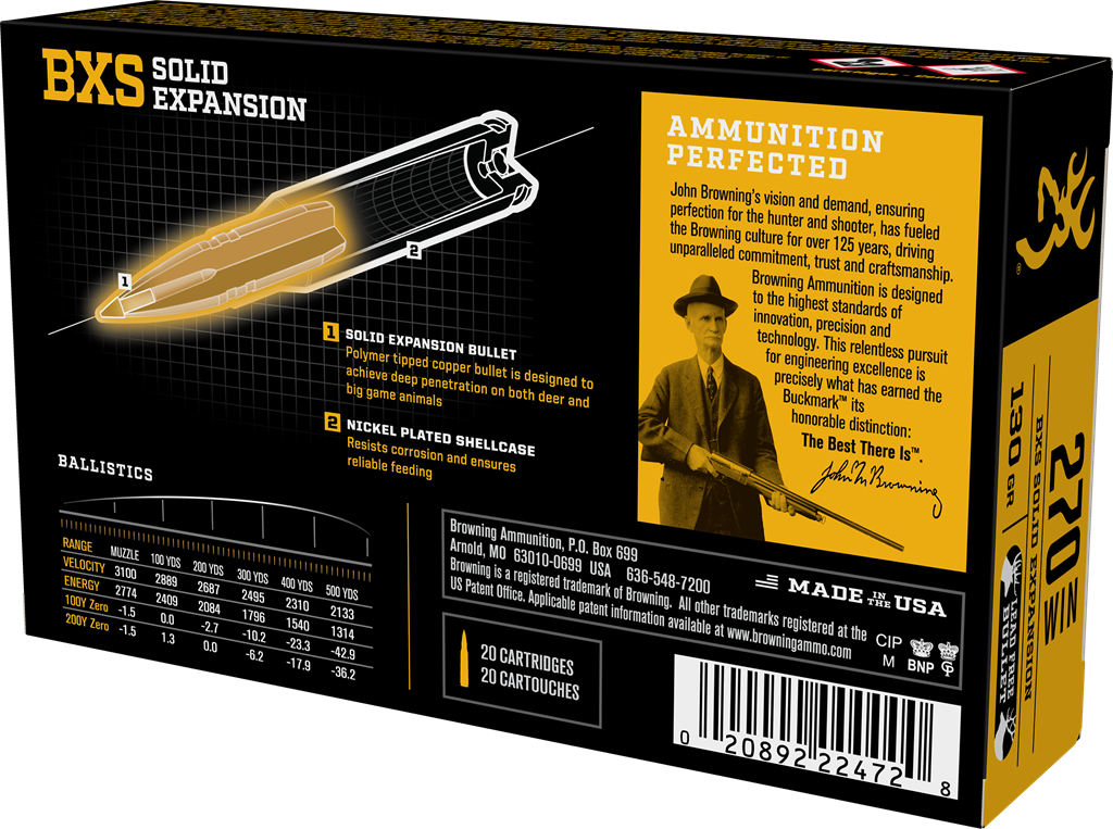 La munition Browning BXS Solid Expansion offre une balistique optimisée pour la chasse au grand gibier.