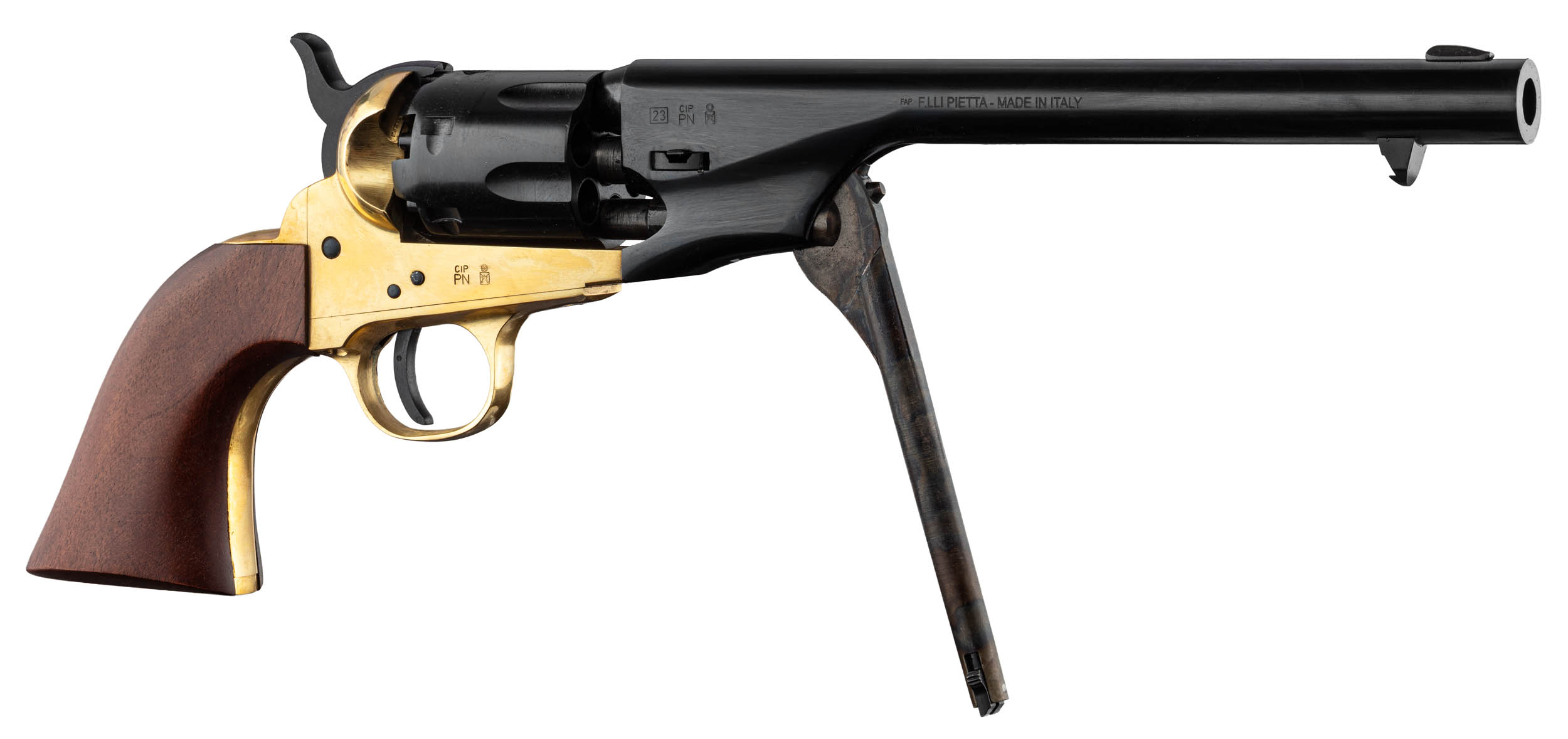 | Réf. RE481 | Désignation PIETTA.PPE36 Revolver 1862 Police Pony Express laiton Cal. 36 | Catégorie légale Vente libre | Calibre .36 PN | Coups 6 | Canon (cm) 14 | Longueur (cm) 28.5 | Poids (g) 1100 |