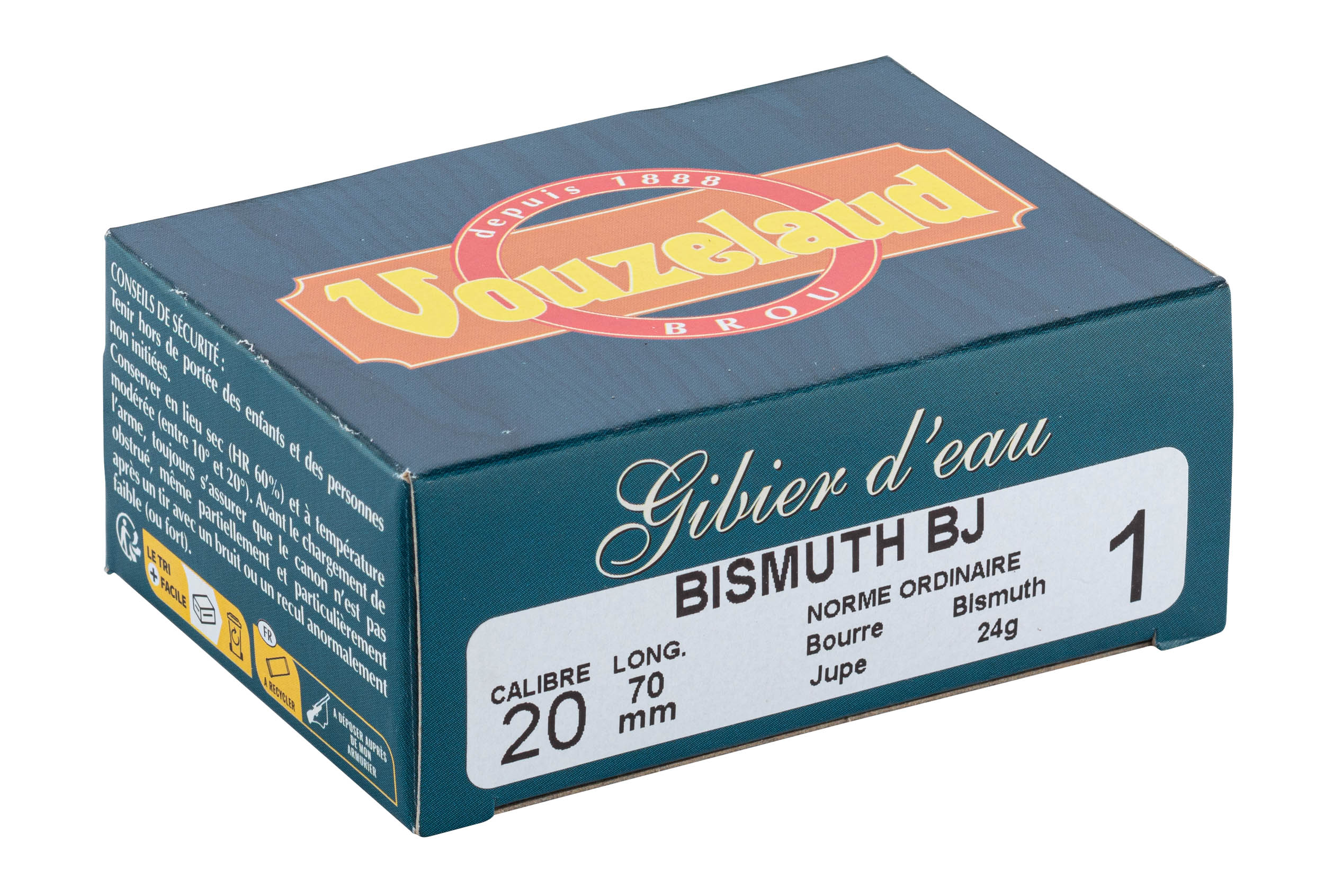 | Réf. ML3331 | Désignation VOUZELAUD - BISMUTH - CAL.20/70 - 24gr - P.1-BTE/10 | Catégorie légale C | Pression des cartouches SP (Pressions Standards) | Calibre cal. 20 | Chambre (mm) 70 mm | Culot (mm) 16 | Vitesse (m/s) 400 | Bourre Jupe | N° de Plombs 1 | Cdt 10 | Grammes 24 | Coloris Jaune |