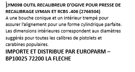 | Réf. LYM096 | Désignation .452 H&I SIZING DIE #2766516 | Catégorie légale Vente libre | Diam. ('') 0.452 |