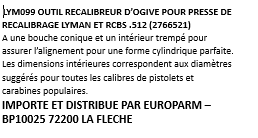 | Réf. LYM099 | Désignation .512 H&I SIZING DIE #2766521 | Catégorie légale Vente libre | Diam. ('') 0.512 |