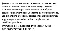 | Réf. LYM102 | Désignation .360 H&I SIZING DIE #2766495 | Catégorie légale Vente libre | Diam. ('') 0.36 |