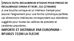| Réf. LYM125 | Désignation .321 H&I SIZING DIE #2766485 | Catégorie légale Vente libre | Diam. ('') 0.321 |