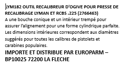 | Réf. LYM182 | Désignation .225 H&I SIZING DIE #2766463 | Catégorie légale Vente libre | Diam. ('') 0.225 |
