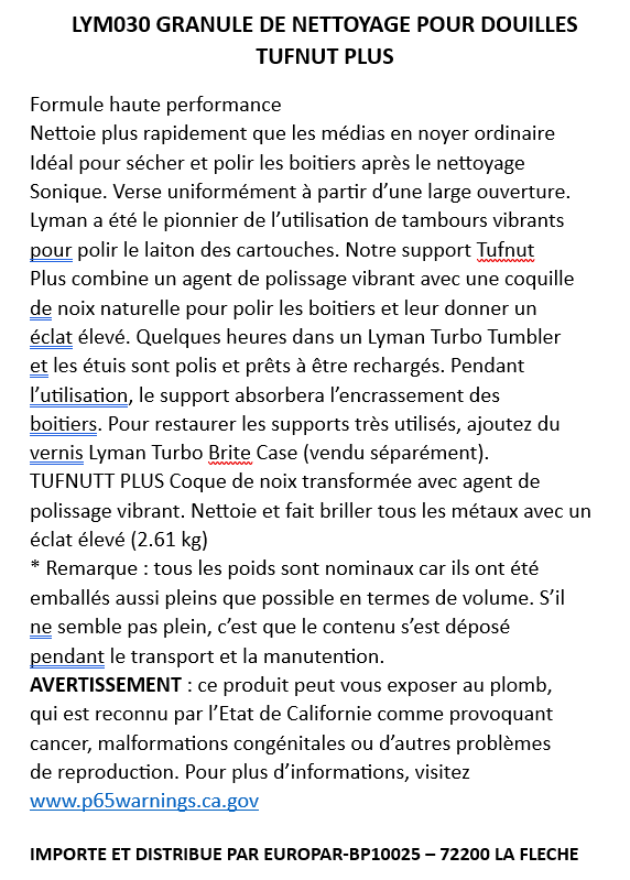 Le Lyman Case Cleaning Media est le choix le plus efficace pour nettoyer les étuis sales et ternis. Granulé de nettoyage à base de coquille de noix traitée, livré dans un pot réutilisable à bec verseur très pratique à utiliser. Les granulés Tufnut de Lyman restent le choix idéal pour le nettoyage de vos douilles après le tir. Enlève les traces de poudre et les imbrûlés tout en redonnant un aspect poli neuf à vos étuis.
