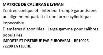 | Réf. LYM260 | Désignation .314 H&I SIZING DIE #2766553 | Catégorie légale Vente libre |