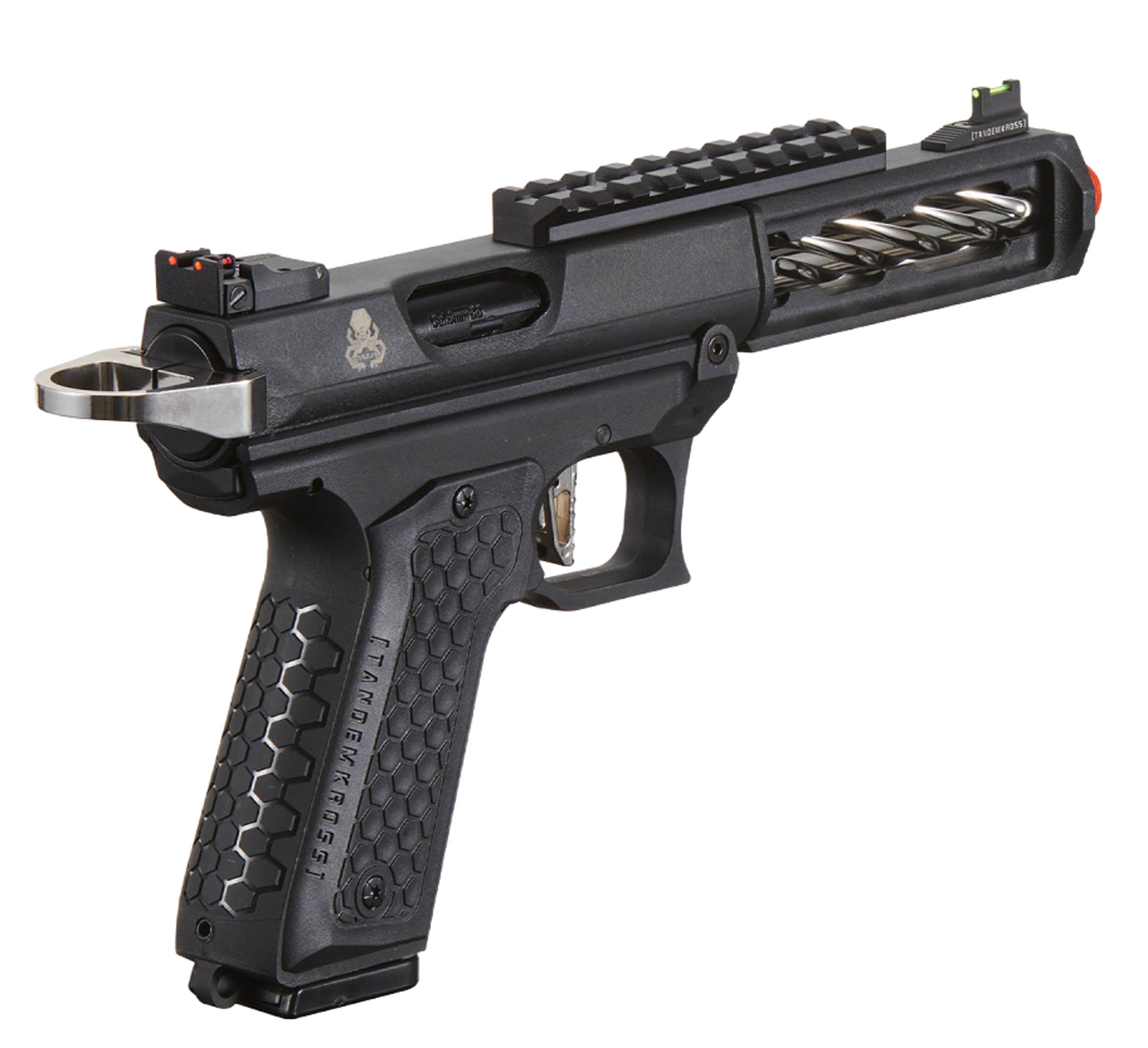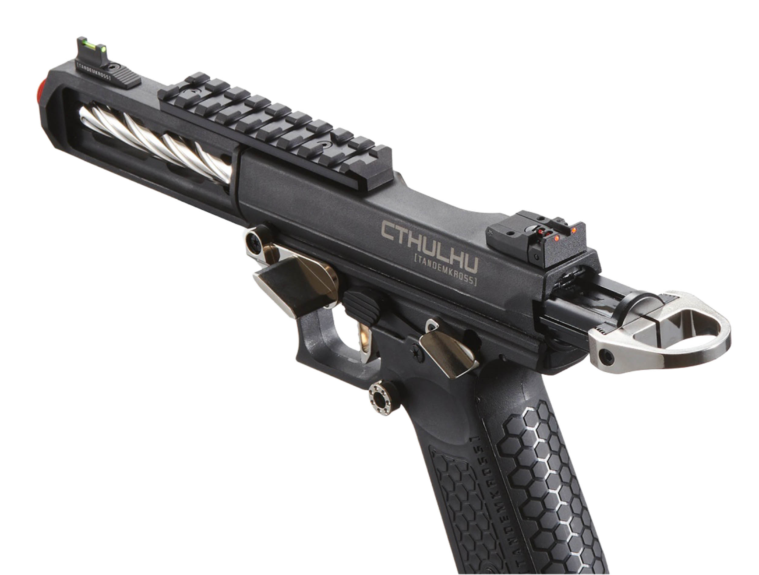 Le CTHULHU reprend les codes des pistolets modernes de compétition : détente squelettée pour une réponse rapide, blowback réactif pour un ressenti réaliste et sélecteur full-auto pour plus de polyvalence. L’ensemble est complété par un anneau de chargement Halo facilitant les manipulations et par des mires à fibre optique Eagle Eye (avant/arrière réglables) pour une acquisition rapide de la cible.