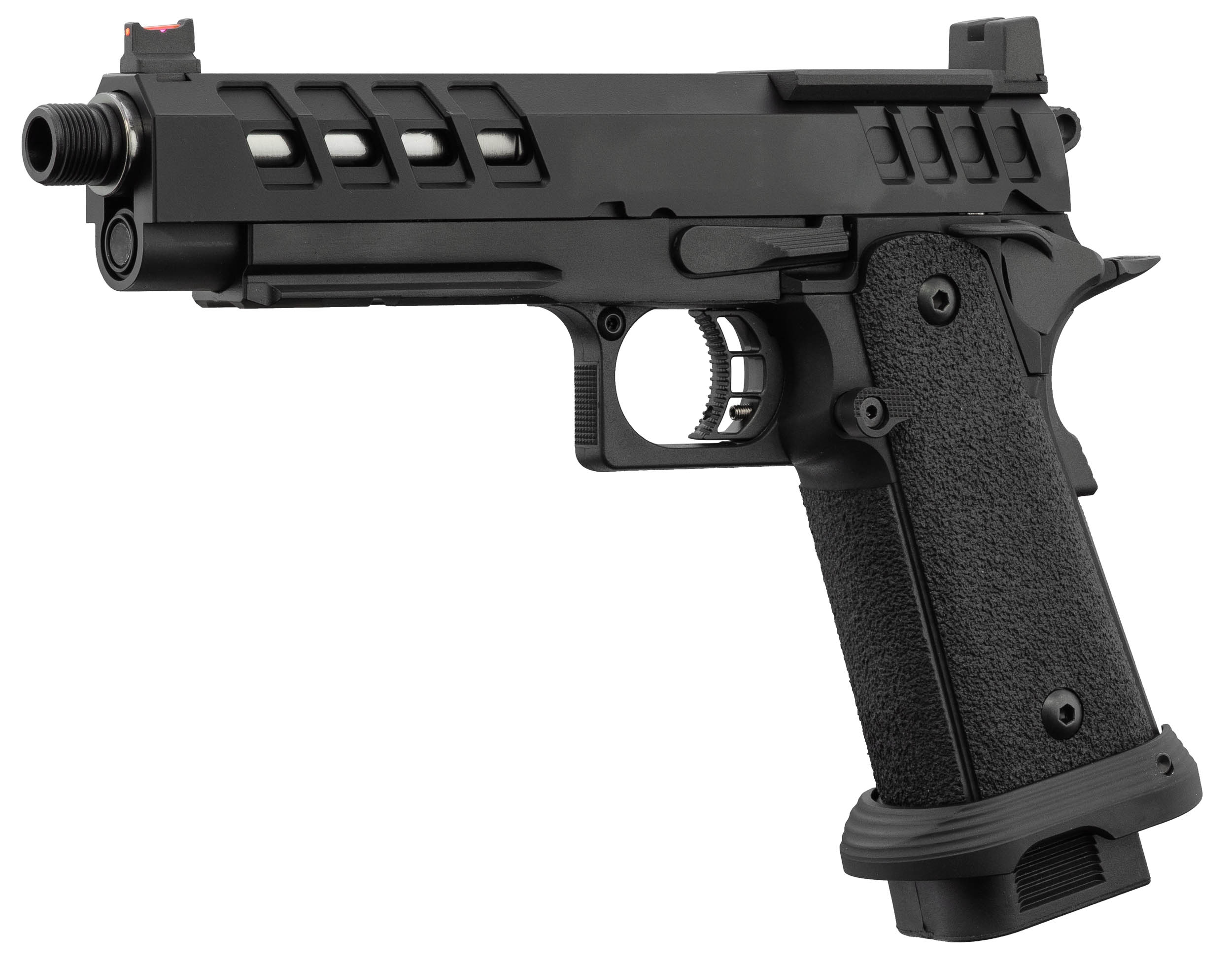 Le HERACLES Hi-Capa 5.1 repose sur une recette simple mais efficace : une culasse aluminium ajourée pour réduire la masse en mouvement, une poignée agressive pour un maintien irréprochable et un magwell intégré pour accélérer les rechargements en situation réelle.