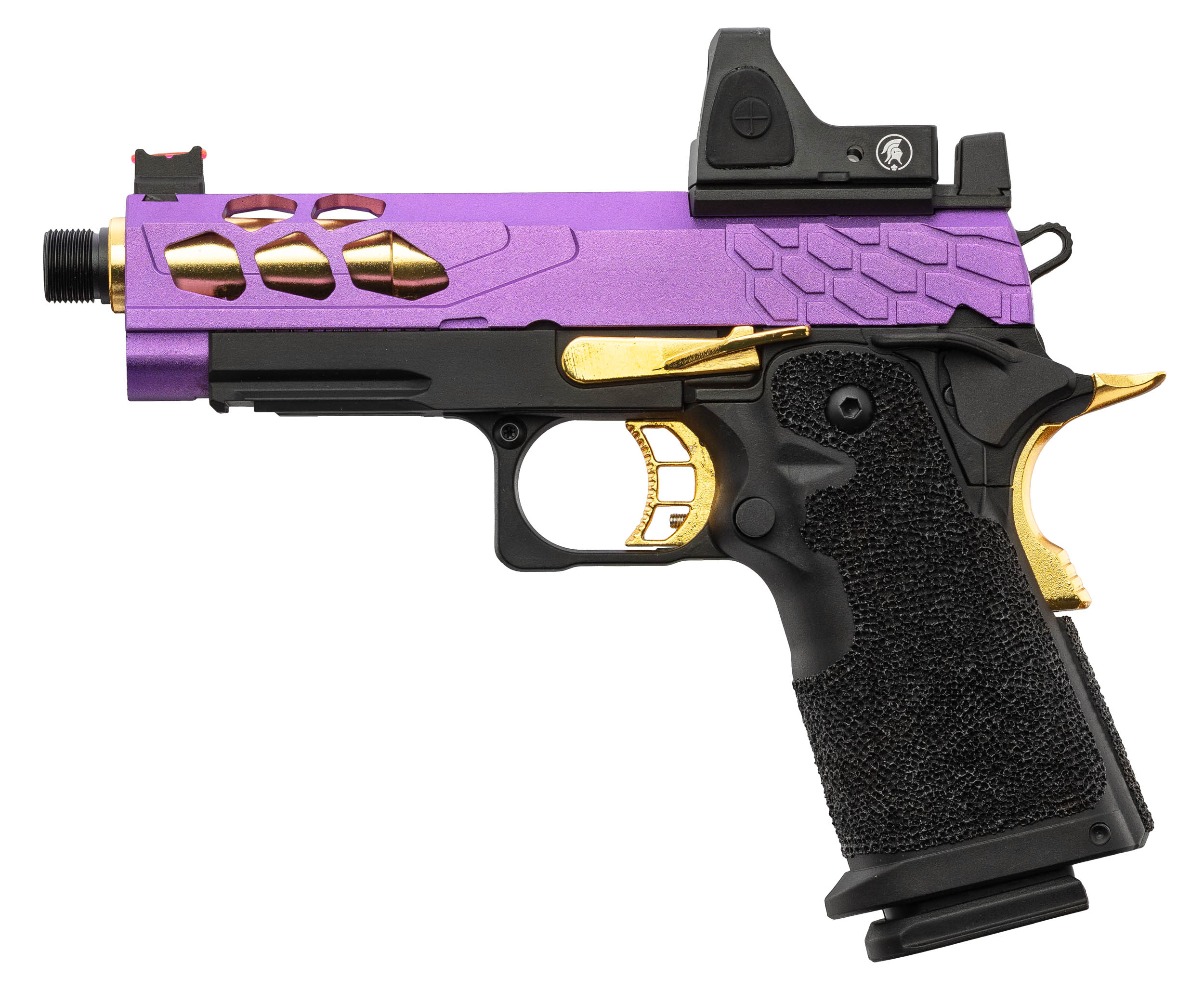Le Stryk Hi-Capa 4.3 Violet/Or se démarque par son équilibre parfait entre esthétique et efficacité. Sa glissière ajourée réduit le poids en mouvement pour un cycle plus rapide, tandis que son RMR inclus améliore la vitesse d’acquisition des cibles.