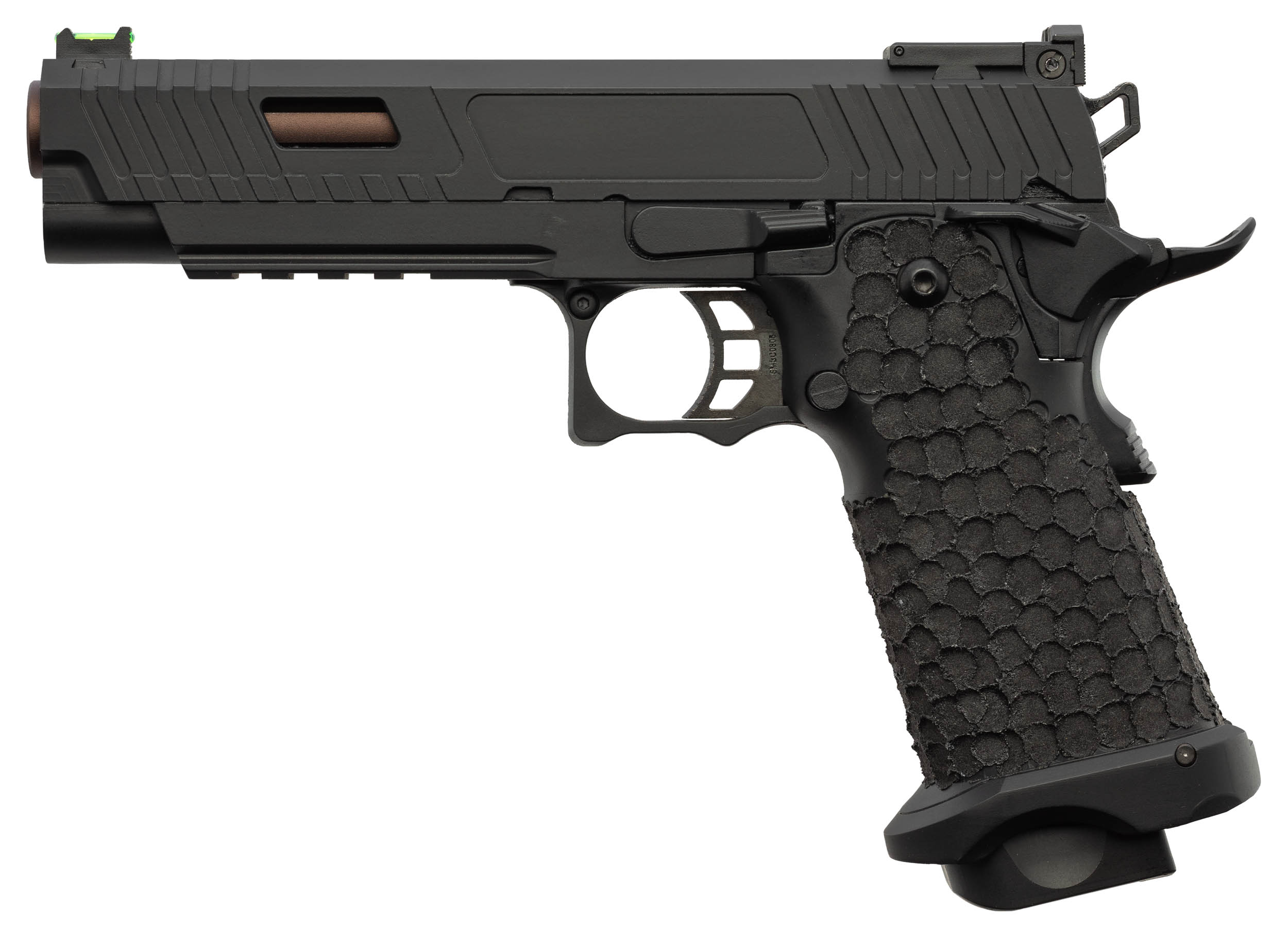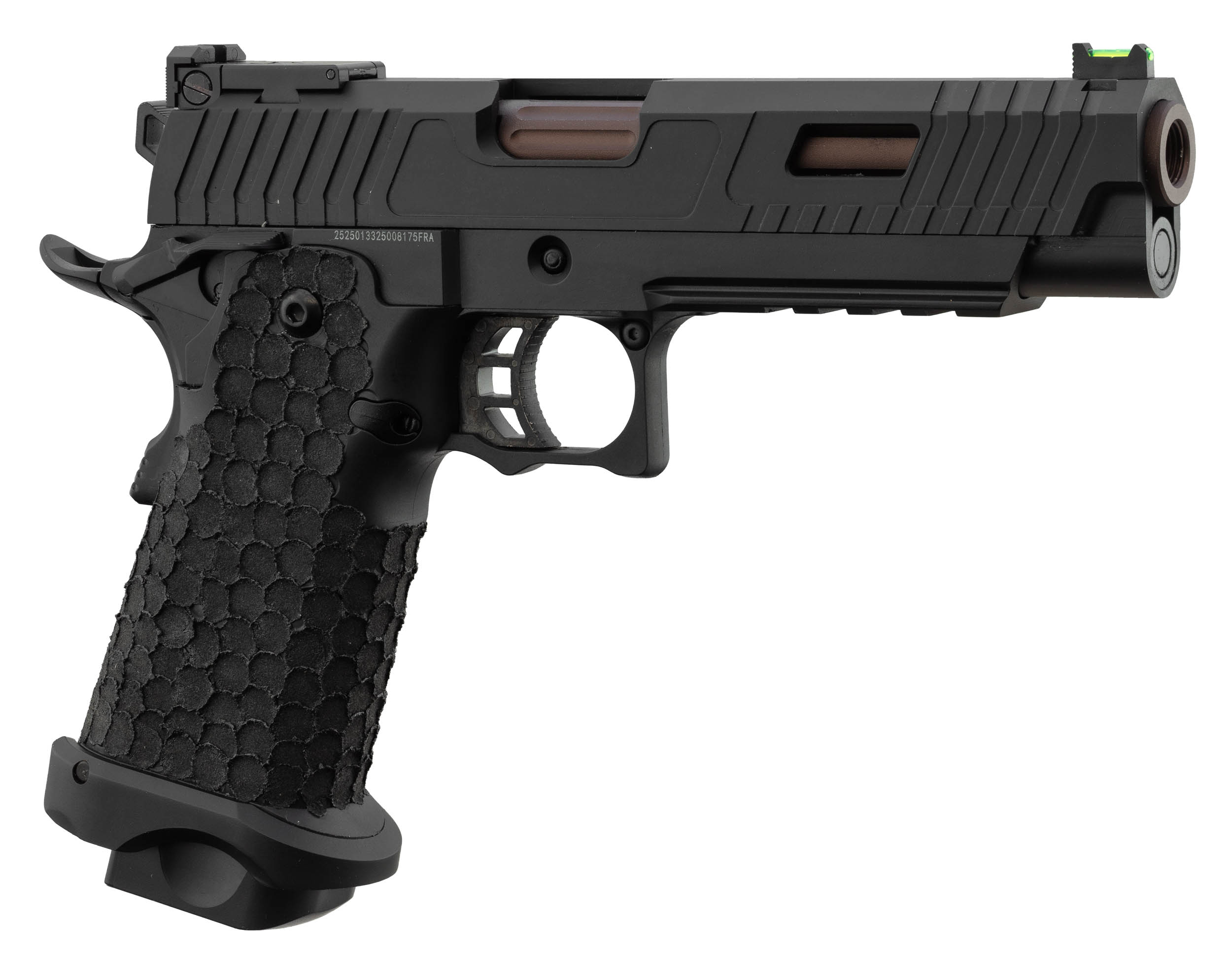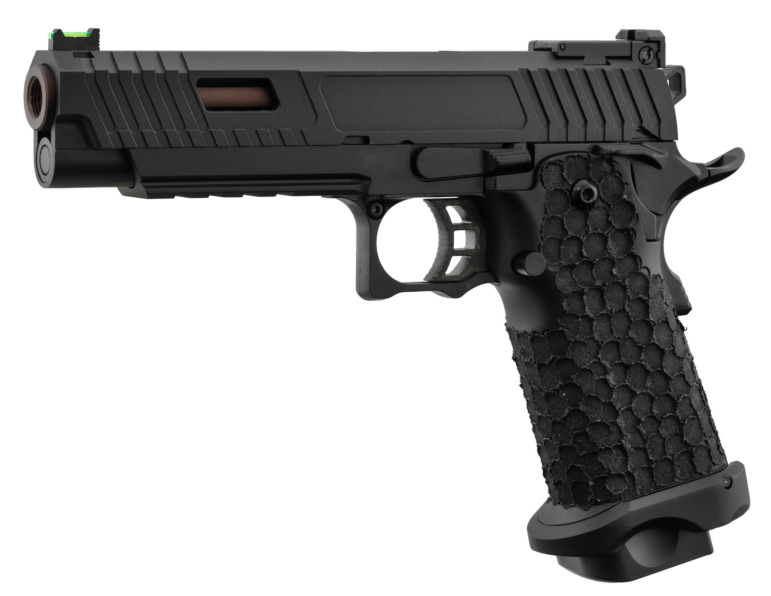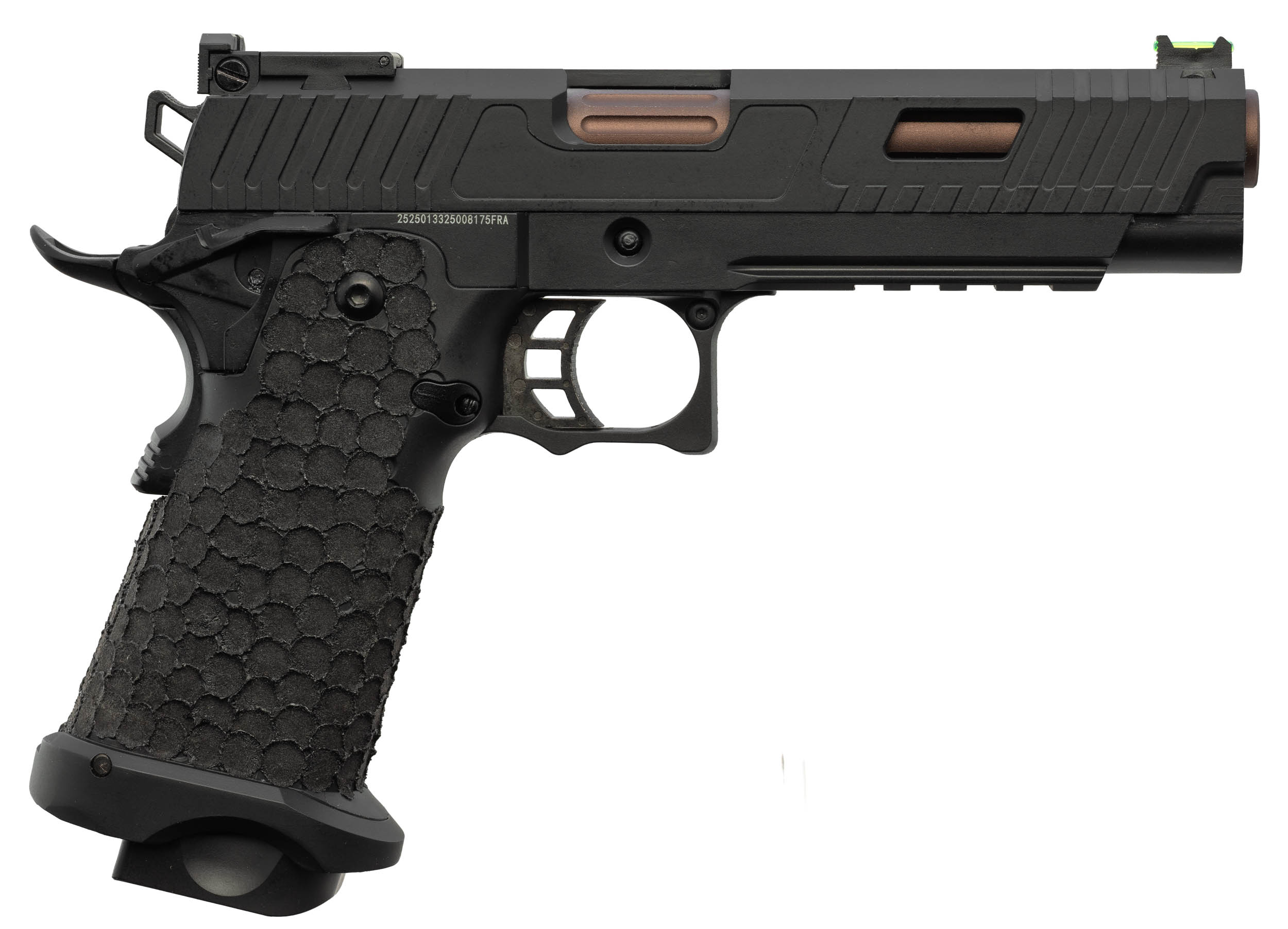 Le Hi-Capa 5.1 Noir/Bronze de Golden Eagle combine une esthétique affirmée (culasse ajourée et touches bronze) avec une base technique Hi-Capa conçue pour l'usage terrain et la personnalisation.