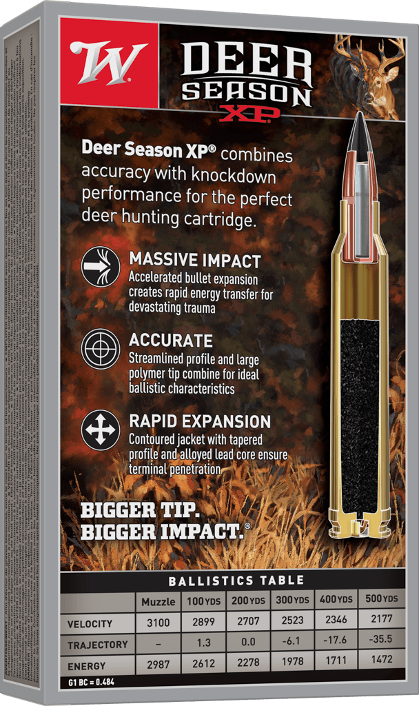 La Winchester Extreme Point combine puissance et précision grâce à une pointe polymère surdimensionnée qui garantit une expansion ultra-rapide et un transfert d’énergie maximal.