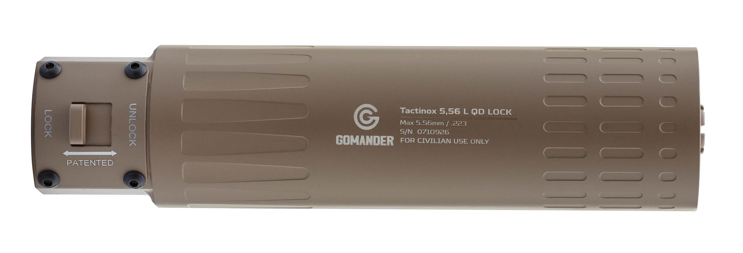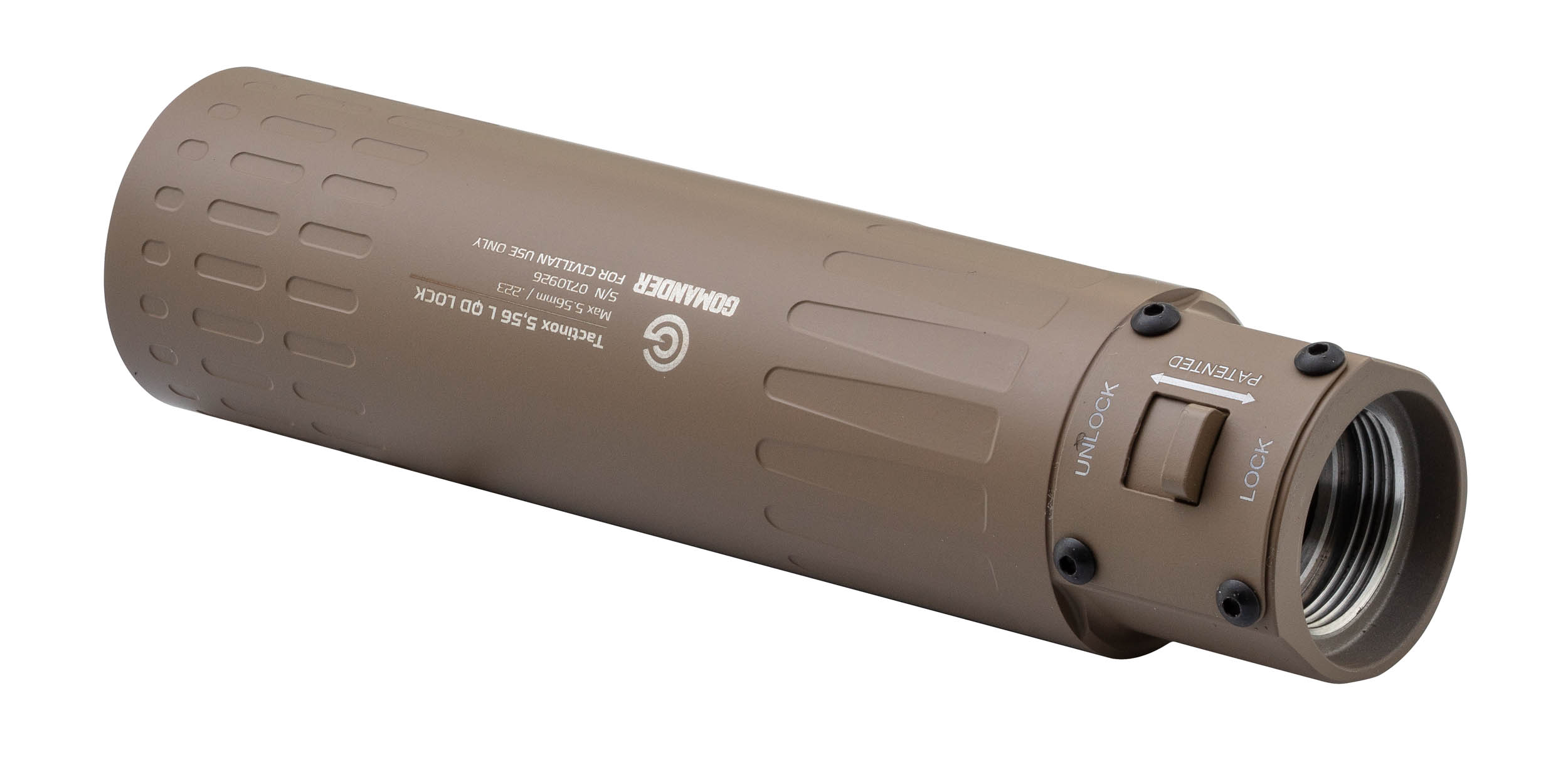 Le TACTINOX 5.56 L QD LOCK adopte un système de fixation rapide simple et fiable. Il se visse sur un frein de bouche GOMANDER (non fourni), puis se verrouille à l’aide d’un levier ergonomique, facilement manipulable avec des gants ou en conditions humides.