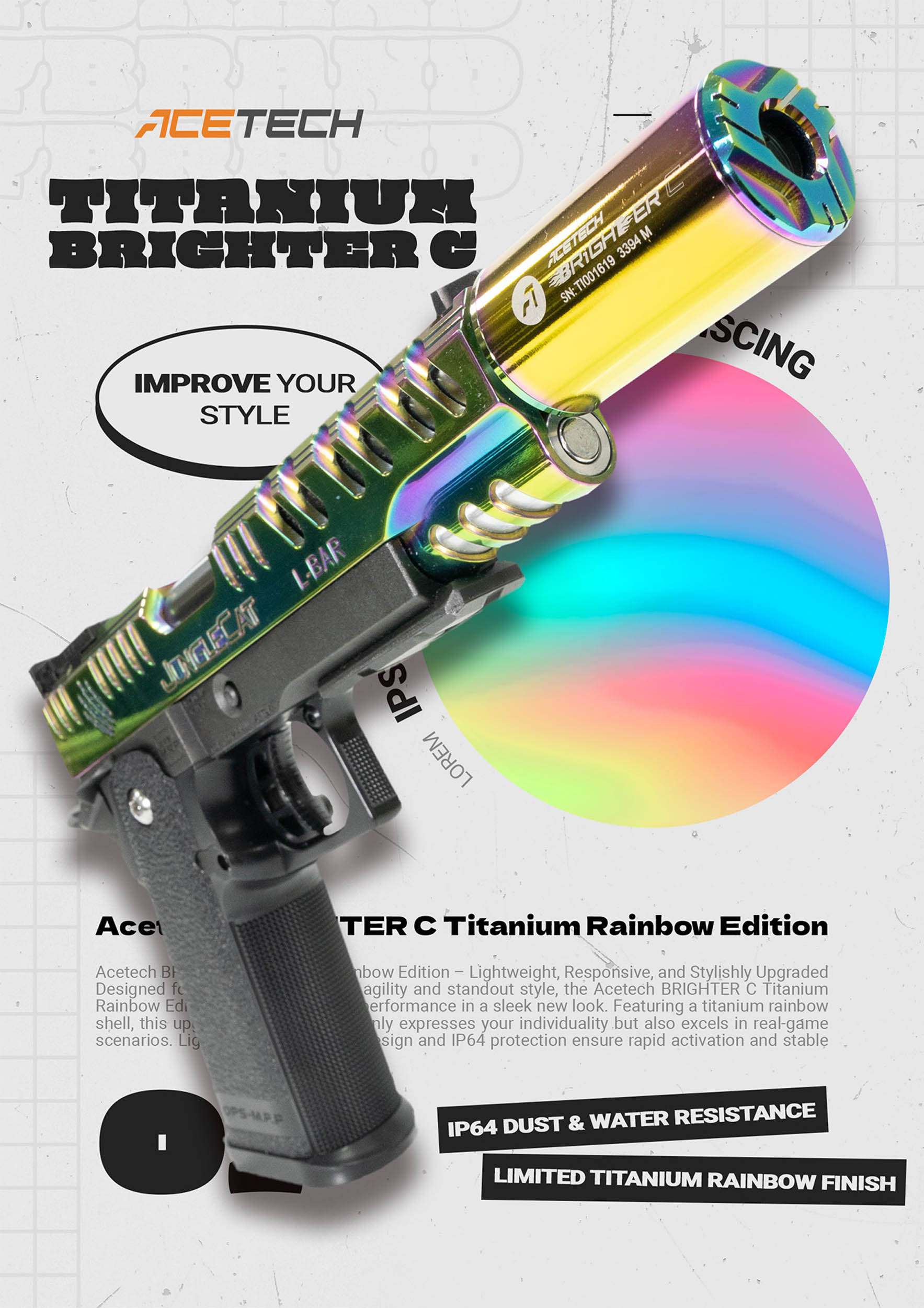 Conçu pour les joueurs exigeants l'Acetech BRIGHTER C Titanium Rainbow Edition offre des performances de pointe avec un nouveau look élégant. Doté d'une coque en titane arc-en-ciel, ce traceur amélioré exprime non seulement votre individualité, mais excelle également dans les situations de jeu réelles. Sa conception légère et sans interrupteur, ainsi que sa protection IP64, garantissent une activation rapide et des performances stables, que ce soit en intérieur en CQB ou sur les terrains de milsim extérieurs.