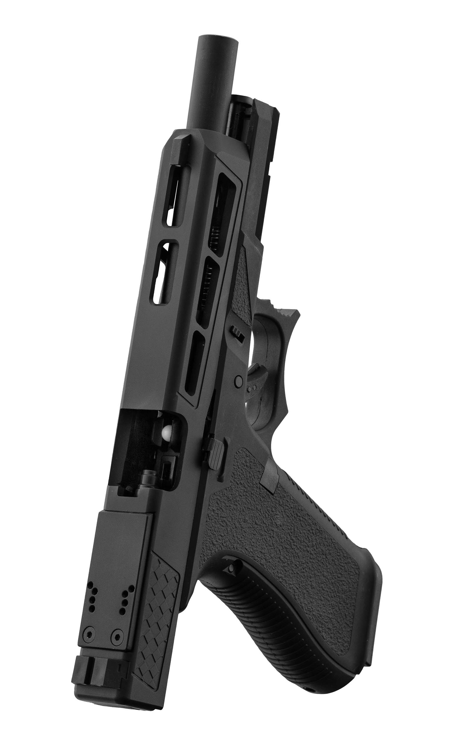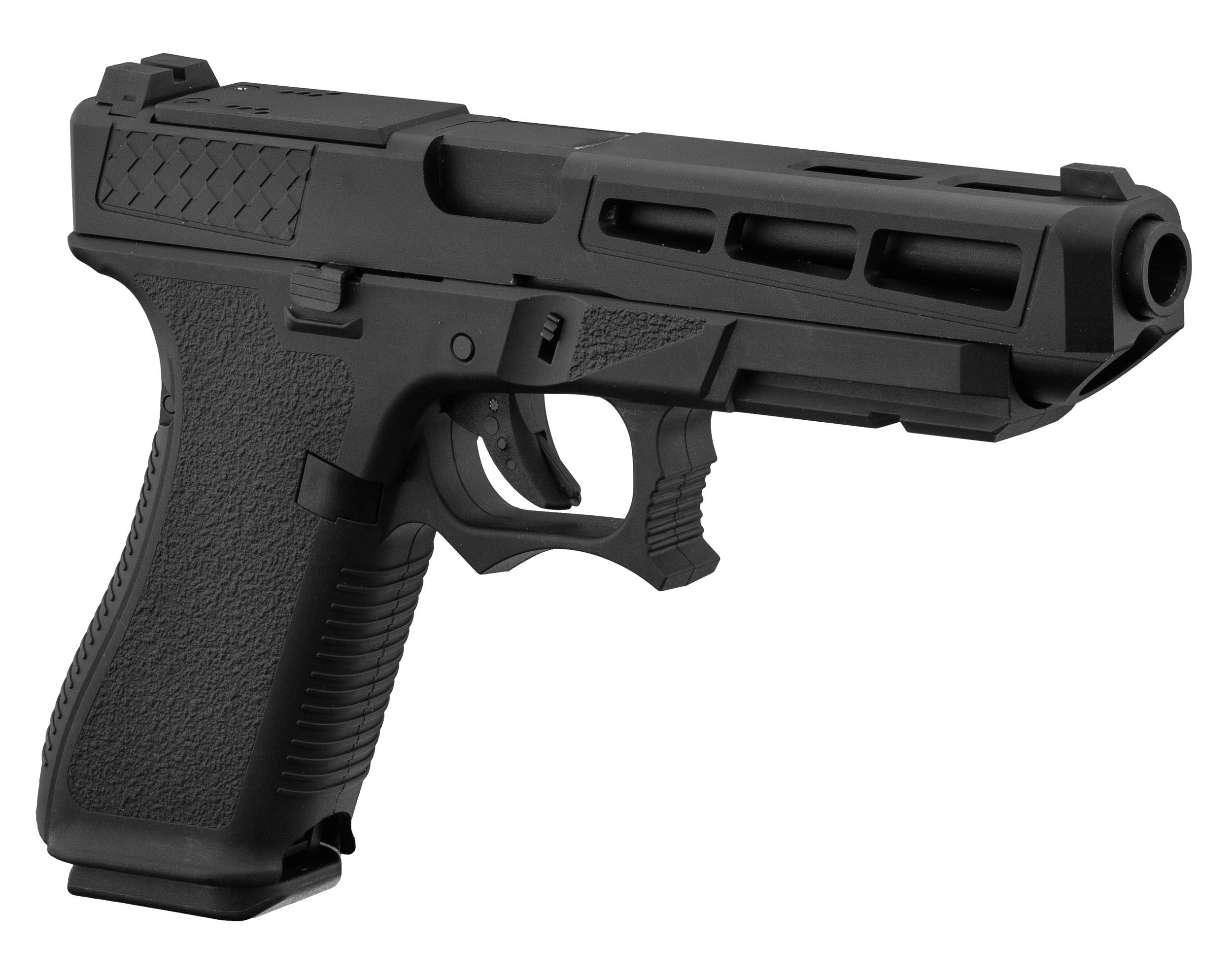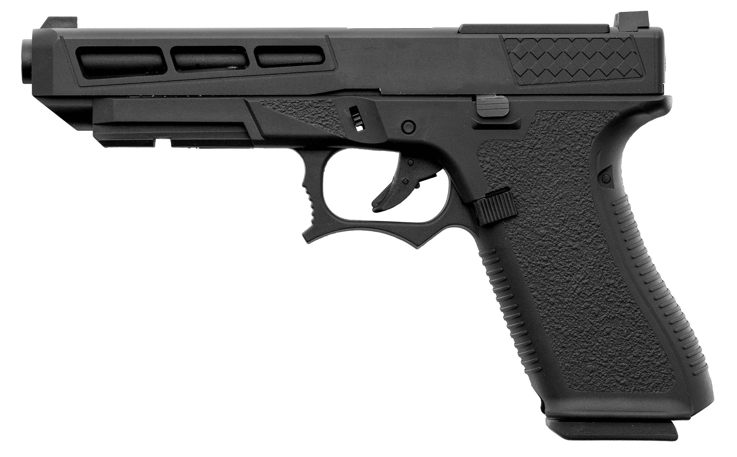 Le pistolet repose sur un système Gaz Blowback offrant un recul réaliste et un cycle semi-automatique fidèle. La culasse métallique striée et ajourée participe à l'esthétique tactique tout en améliorant la dissipation et la rigidité.