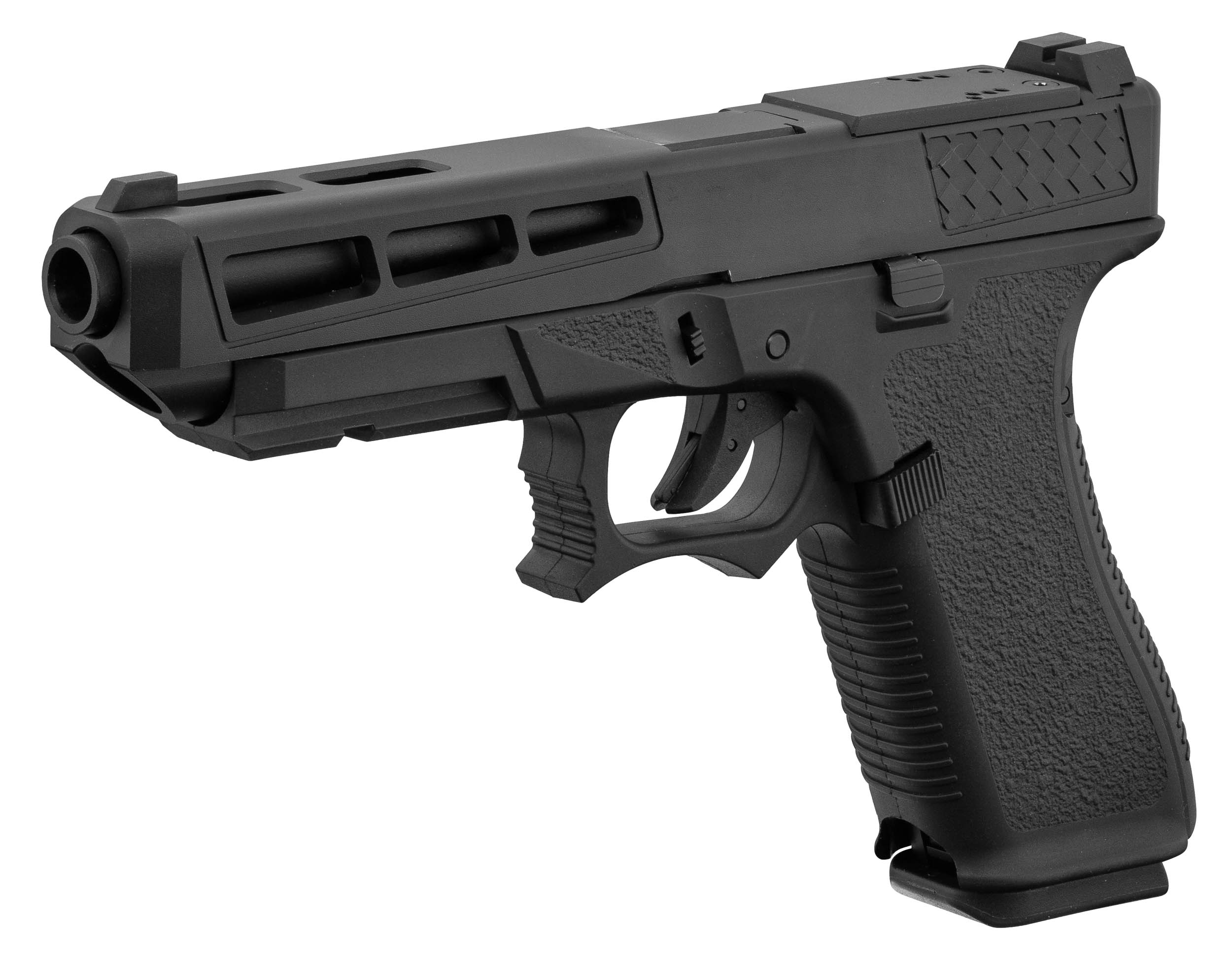 Pratique sur le terrain, la réplique dispose d'un rail inférieur pour lampes/lasers et d'une plaque RMR prête à recevoir une optique compacte. Les viseurs fibre optique améliorent la vitesse d'acquisition en conditions variées et le bouton d'éjection interchangeable facilite l'adaptation aux gauchers.