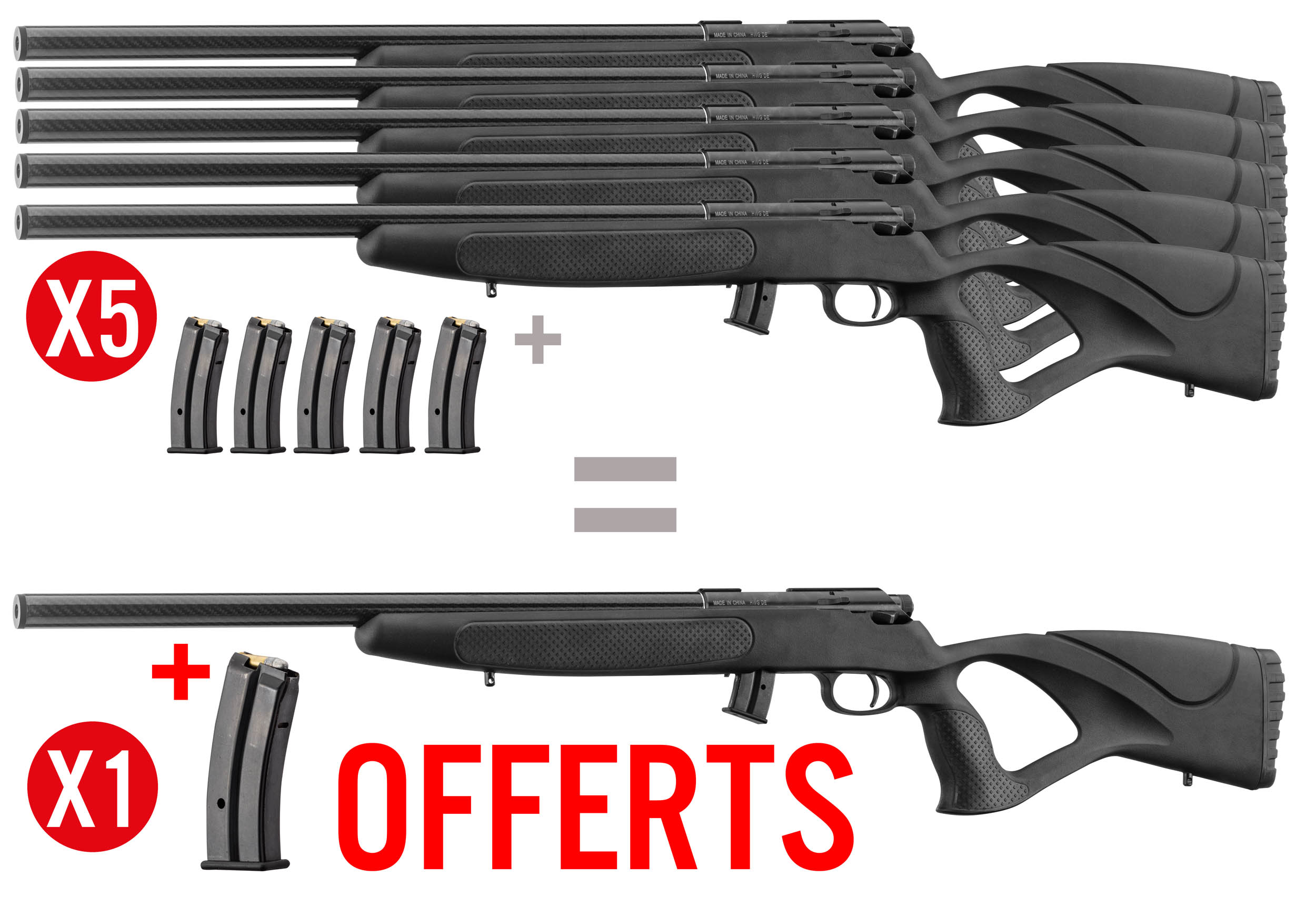 Pack de 6 carabines BO Manufacture Equality Maker 22LR avec modérateur de son intégré, livré avec 6 chargeurs 10 coups pour une utilisation intensive en stand ou sur le terrain.