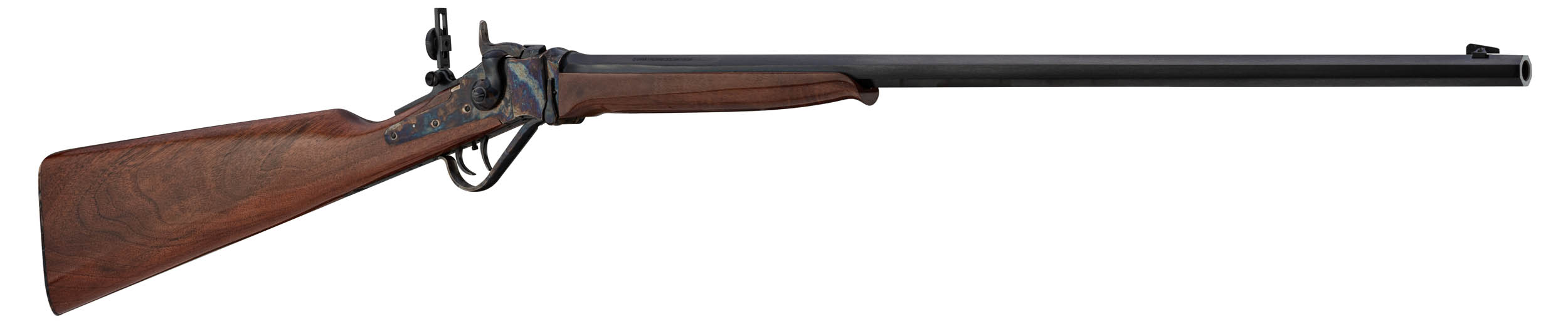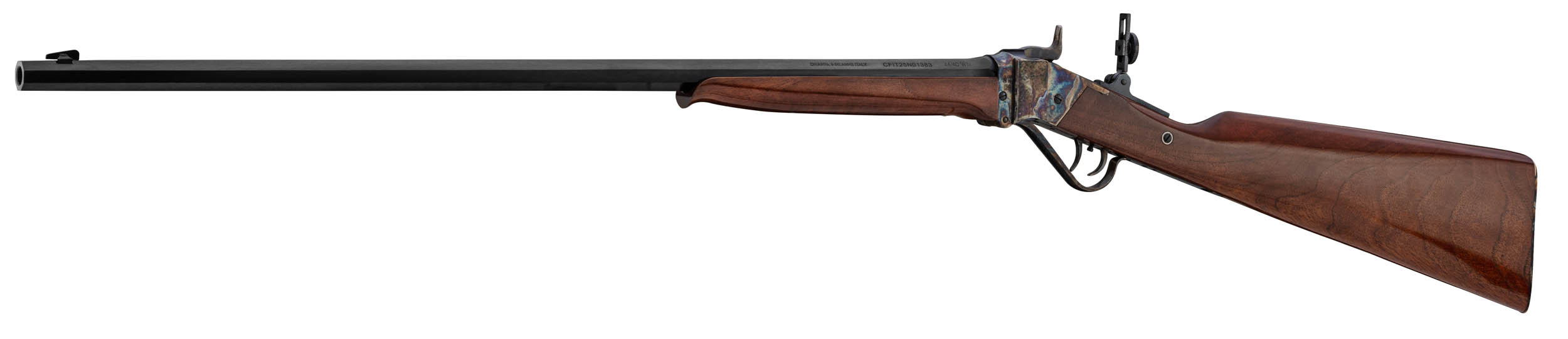 Compacte mais fidèle aux lignes d’époque, cette version "Little" conserve les codes esthétiques du Sharps avec une finition bronzée sur le canon et une bascule color case du plus bel effet. La crosse et le devant sont en noyer huilé à la main, offrant à la fois authenticité et confort de prise en main.