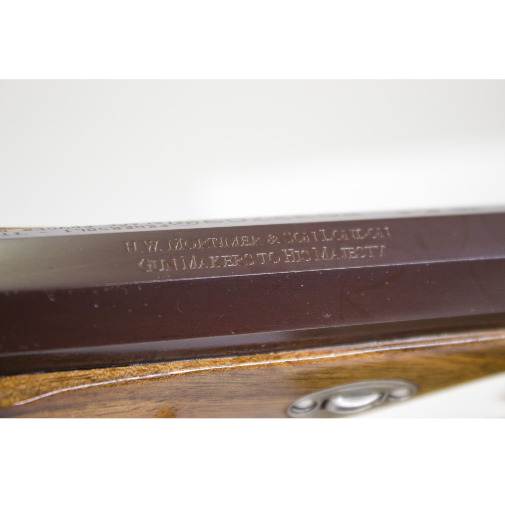 Produits entre 1810 et 1840, les pistolets de duel anglais étaient des armes de précision, sobres et élégantes. Le Mortimer Deluxe reprend cette tradition avec sa crosse galbée en noyer huilé, sa platine soignée et son canon brun au décor doré, directement inspiré des gravures anglaises d’époque.