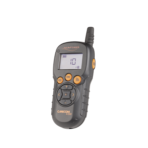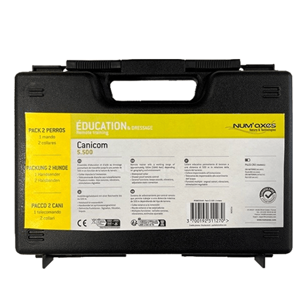 Le NUM’AXES CANICOM 5.500 est un pack prêt à l’emploi pour le dressage simultané de deux chiens à distance, avec une portée maximale de 500 m.