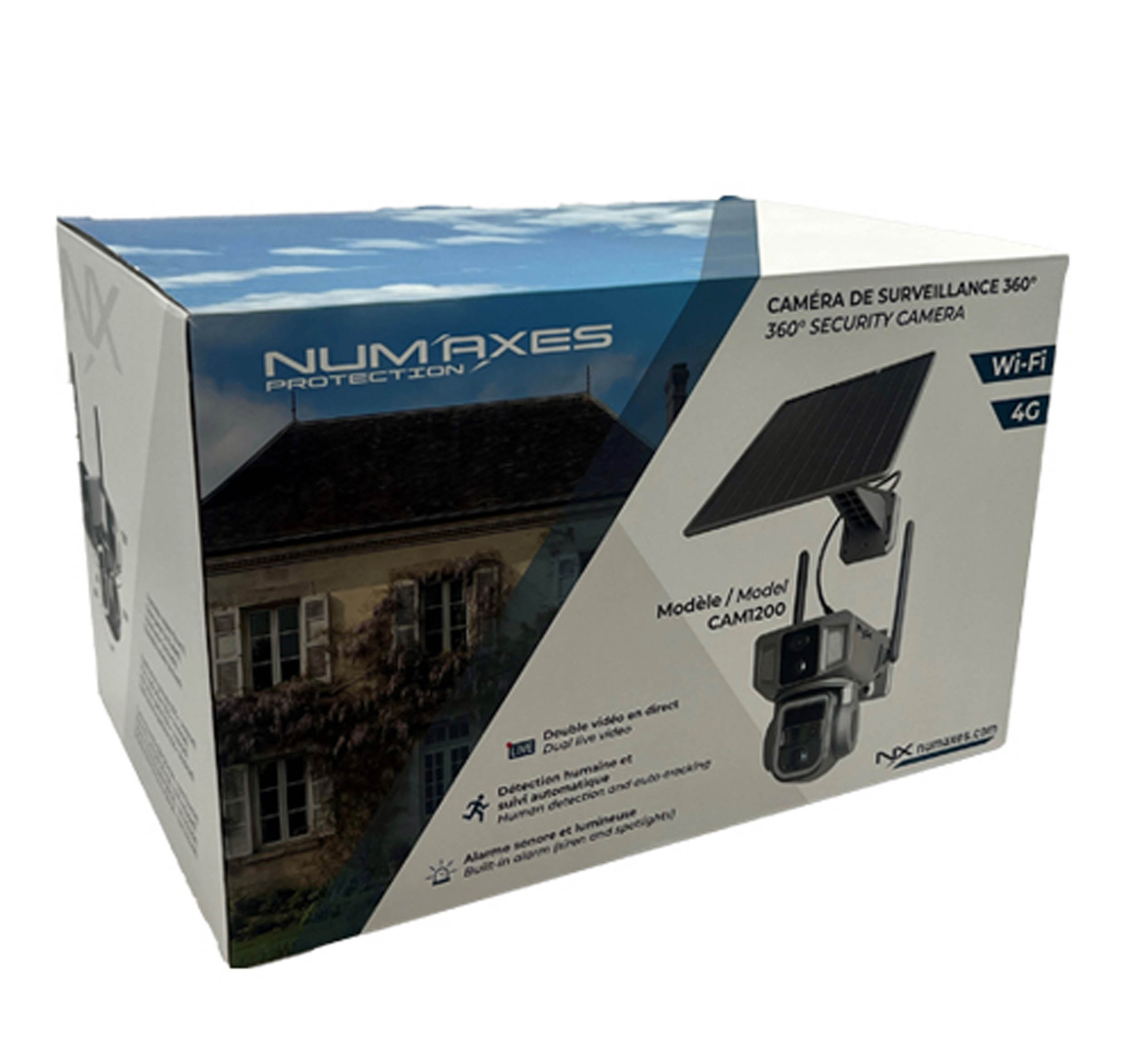 La NUM’AXES CAM1200 est une caméra de surveillance extérieure 360° combinant connexion Wi-Fi et 4G, conçue pour offrir un contrôle à distance en temps réel et une couverture panoramique complète.