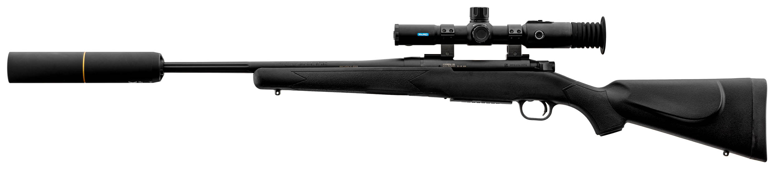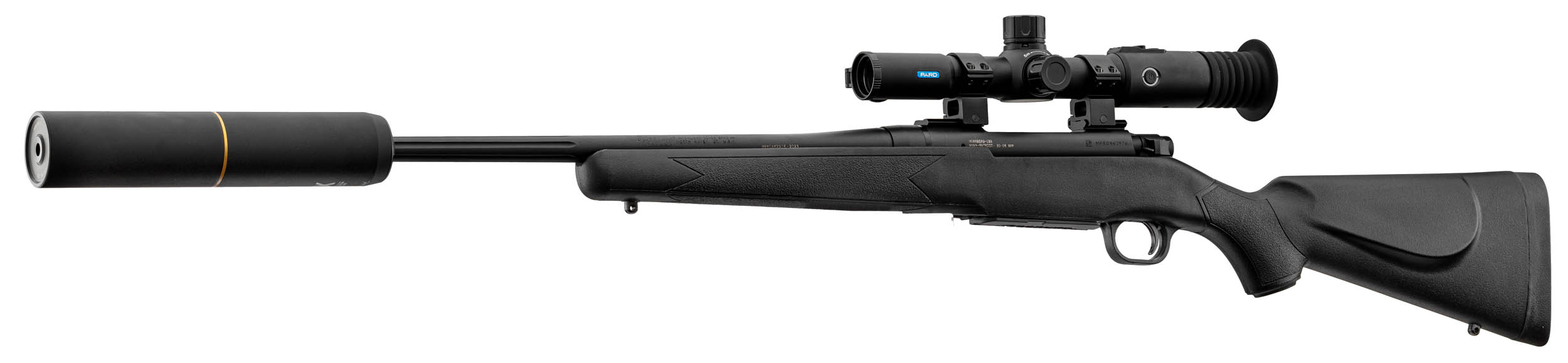 Le pack inclut également un modérateur de son STALON X108 offrant une réduction sonore efficace tout en conservant un design compact et équilibré sur la carabine. Les colliers de montage 30 mm assurent une fixation stable de la lunette thermique sur le rail Weaver.
