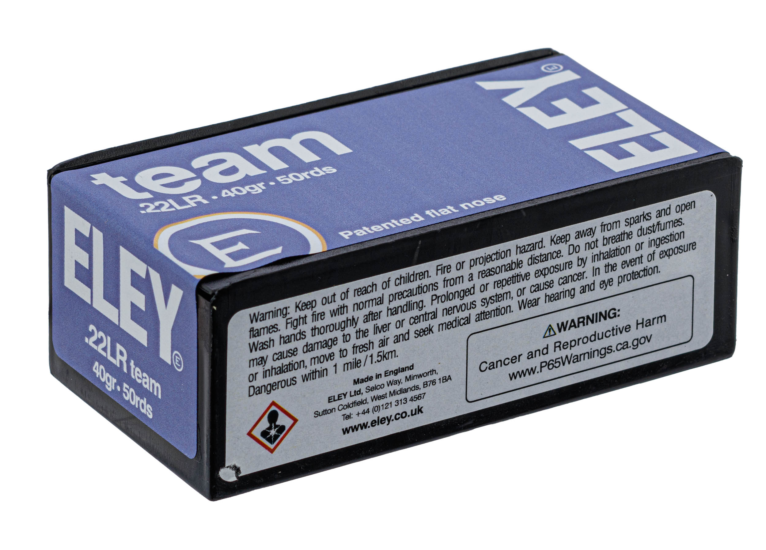 | Réf. MD918 | Désignation Cartouches 22LR Eley team - boîte de 500 | Catégorie légale C | Calibre .22 LR | Vitesse (m/s) 331 | Matériaux du projectile Plomb | Cdt 50 | Grains 40 | Grammes 2.59 |