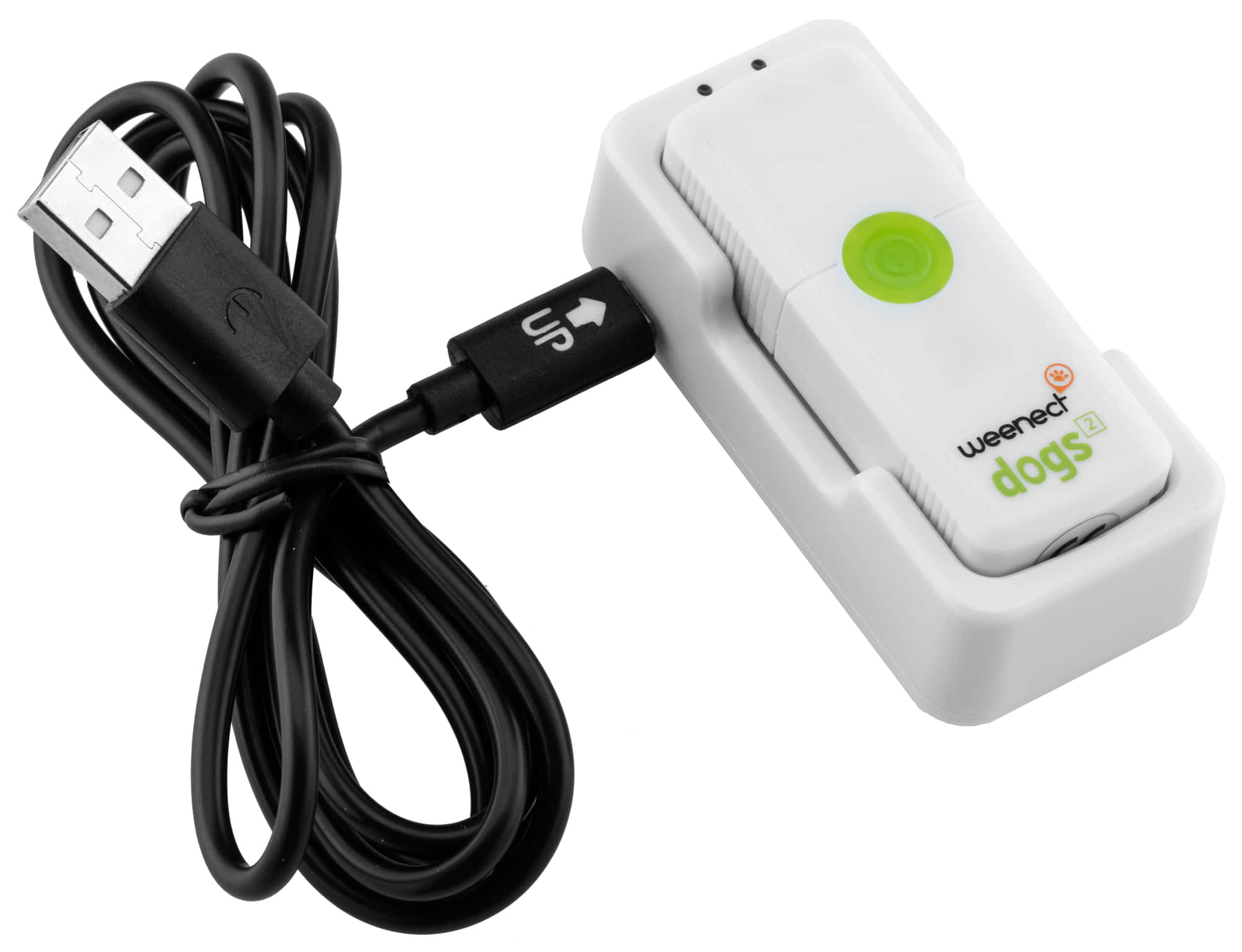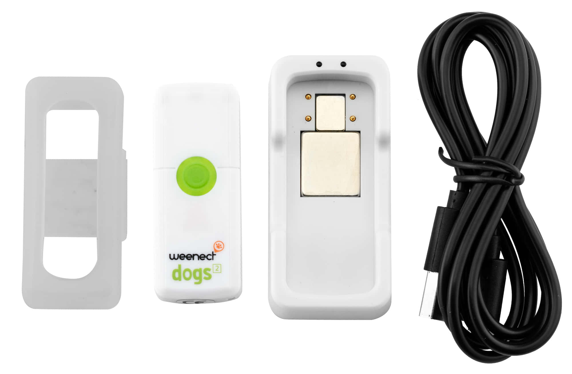 La boîte contient : un traceur GPS Weenect Dogs 2, un câble USB, un socle de chargement aimanté, une coque silicone attachable sur tous colliers.