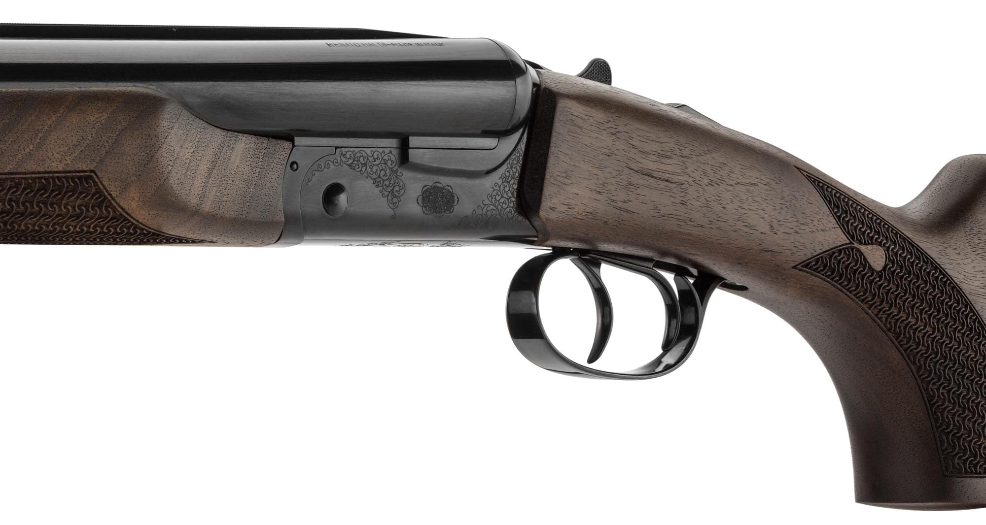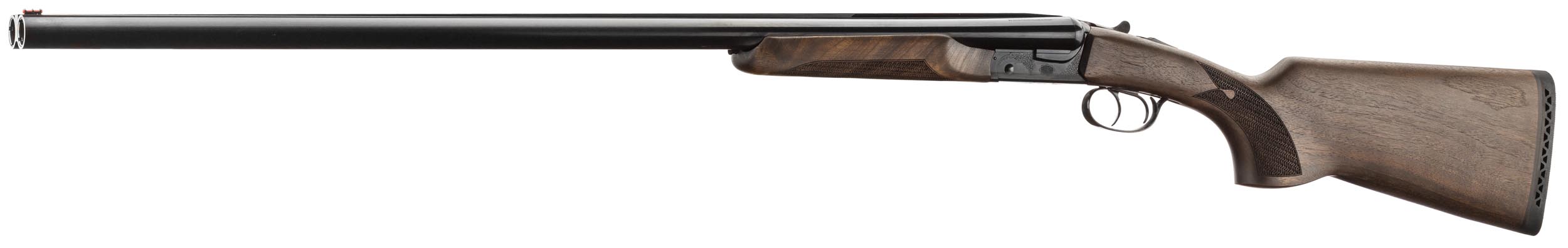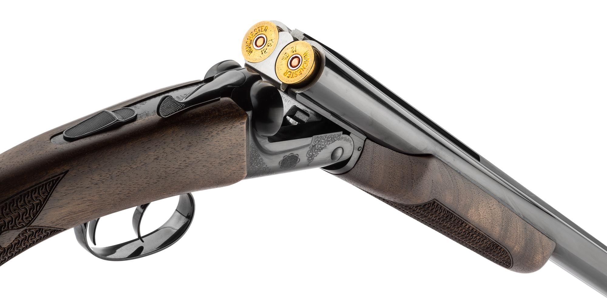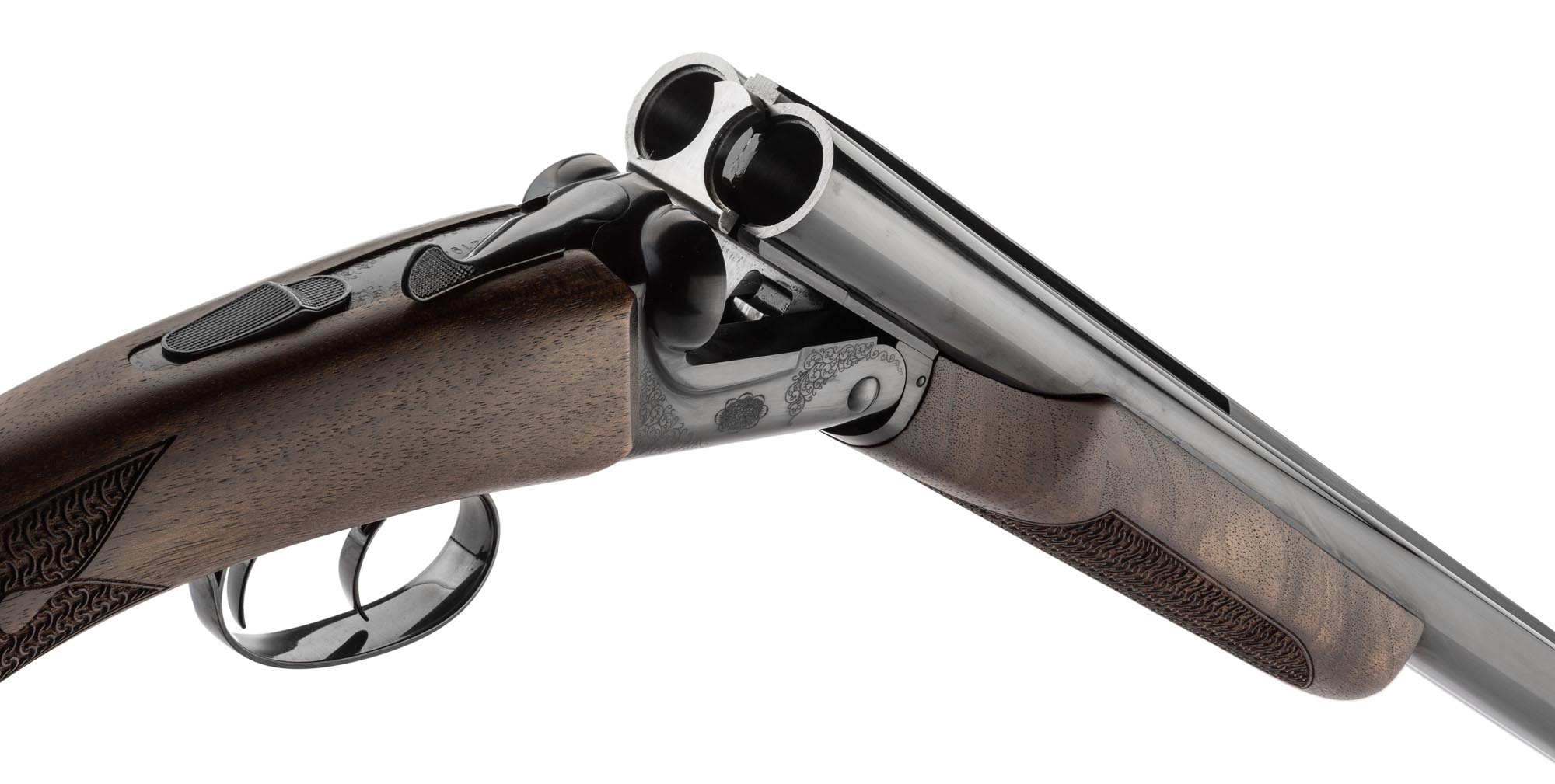 Fusils de chasse juxtaposés : l’essence même du fusil de chasse. Bascule jaspée à système anson, ornée de fines gravures anglaises, canons parallèles à chokes interchangeables, éprouvés pour la grenaille d’acier. Devant enveloppant et crosse noyer.